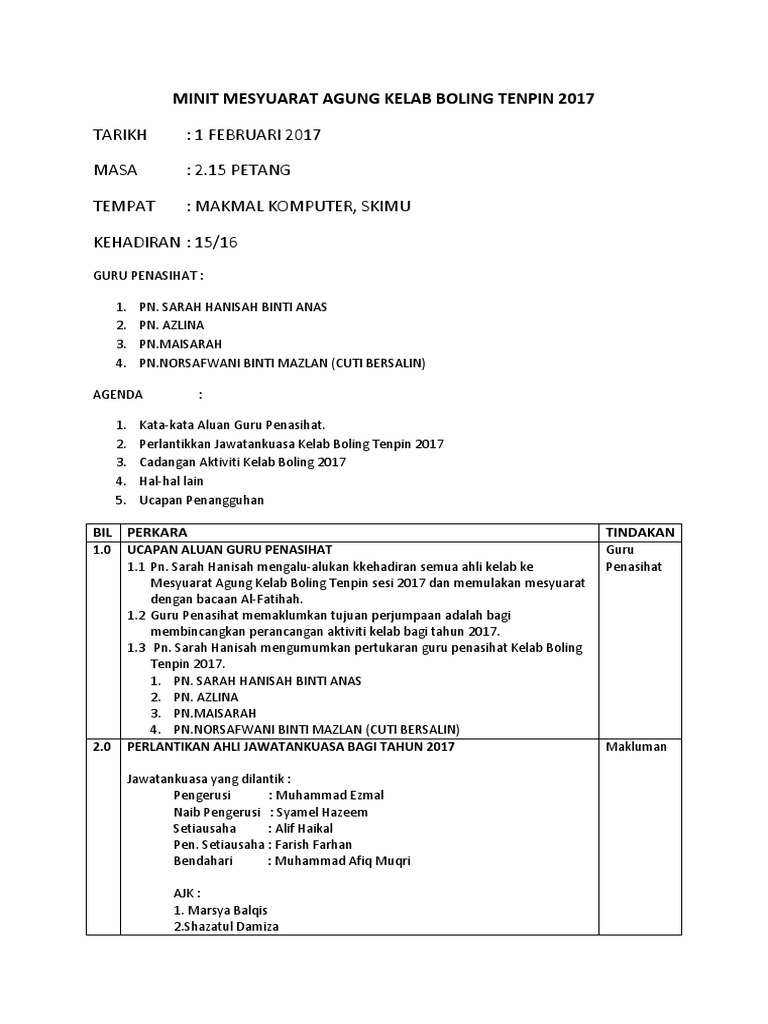 Senarai contoh minit mesyuarat terkini : Biasanya kita akan taip dan tekan space bar (ruang jarak) sahaja untuk membezakan teks bukan? Minit mesyuarat agung tahunan 2018 tarikh. Berikut disertakan cara buat dan contoh minit mesyuarat yang berkualiti lengkap dan mudah beserta maklumat format dan contoh. Minit mesyuarat pengurusan dan pentadbiran bil 1 2019 pages 1 13 text version anyflip.